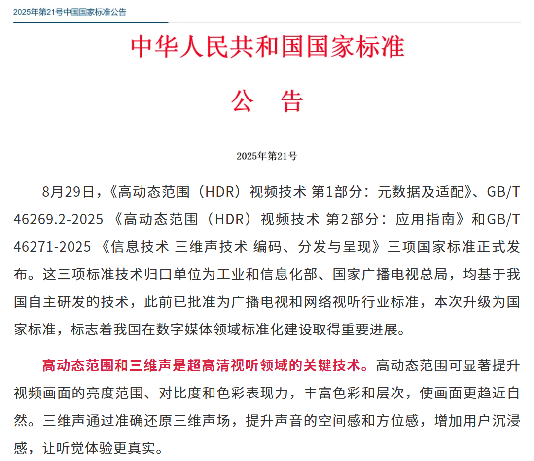 高动态范围、三维声三项国家标准发布